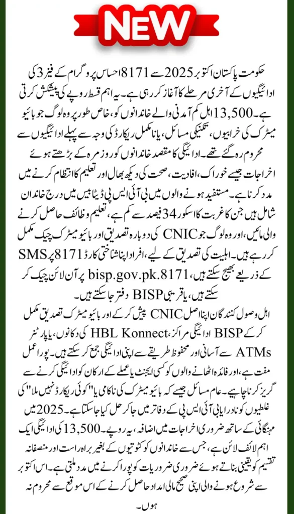 The 8171 Ehsaas Program Phase 3 is the final installment of the current payment cycle for 2025. It is designed to support low-income families who were not able to receive their payments during Phase 1 or Phase 2. This includes people who faced biometric mismatches, “No Record Found” errors, or had incomplete information during earlier phases.