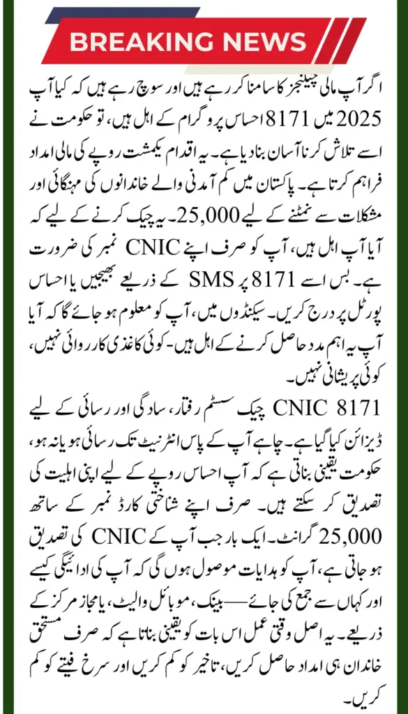 The 8171 Ehsaas Program is a social welfare scheme launched by the Government of Pakistan. Its main goal is to provide financial assistance to families struggling with poverty, inflation, unemployment, or unexpected emergencies. Through this program, eligible households receive a one-time cash grant of PKR 25,000, helping them cover essential living costs and ease financial burdens.