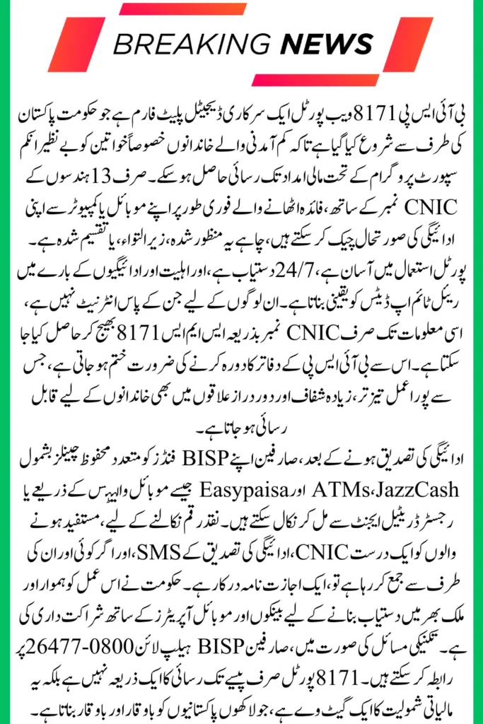 Earlier, checking your BISP payment required going to an office (for information) or calling the helpline. The 8171 portal has made the process at home simple, quick, and safe; anyone can use it 24/7 from their phone or computer.