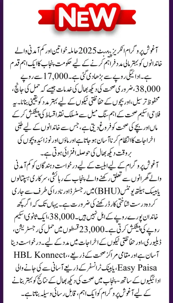 The Aghosh Program 2025 is a vital welfare initiative by the Punjab government aimed at supporting pregnant women and low-income families. With the recent increase in payment to Rs. 38,000, the program now offers even greater financial relief to help with healthcare and child immunization costs. This program ensures that mothers receive support throughout pregnancy and after childbirth, promoting better health outcomes for both mothers and babies.