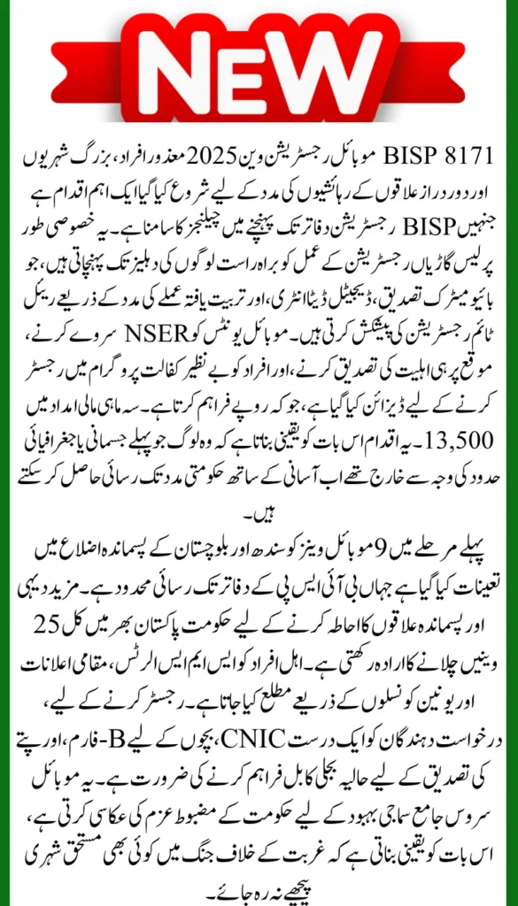 The Benazir Income Support Programme continues to expand its reach with a new initiative that will make a real difference in the lives of thousands of Pakistanis. In 2025, BISP has launched 8171 Mobile Registration Vans, a service specially designed to help disabled individuals, elderly people, and residents of remote areas who are unable to visit registration centers.