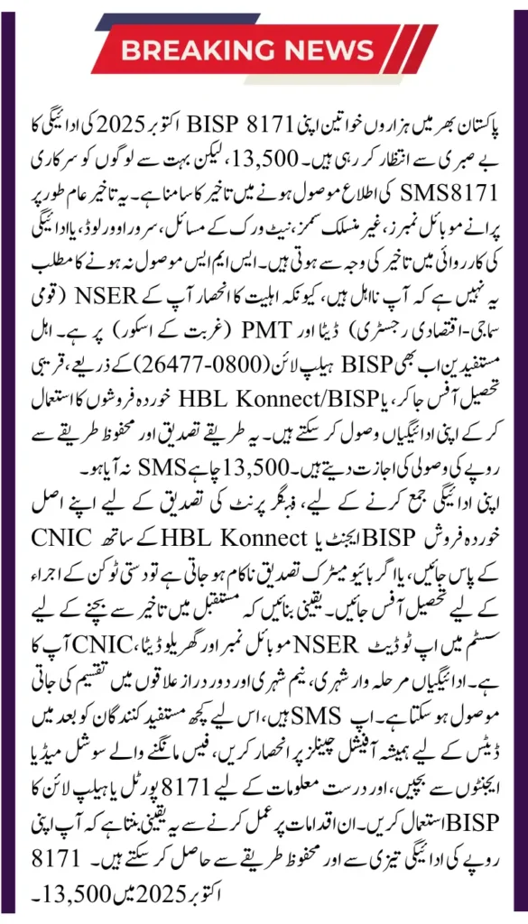 Thousands of women across Pakistan are eagerly waiting for their BISP 8171 October 2025 payment of Rs. 13,500. However, many have reported delays in receiving the official 8171 SMS notification. If you haven’t received your SMS yet, don’t worry a delayed message doesn’t mean you are disqualified. In this guide, we’ll explain why the SMS delay happens, how to check your payment status, and how to receive your Rs. 13,500 safely, even without the message.