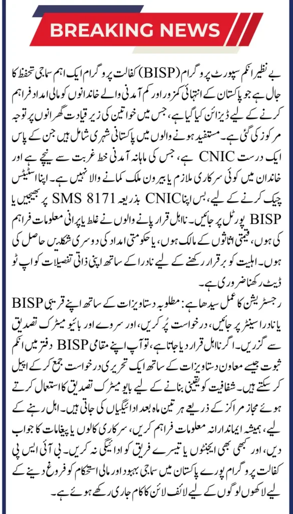 | Appeal Process | Visit BISP office with CNIC & disqualification letter, submit appeal with supporting docs |