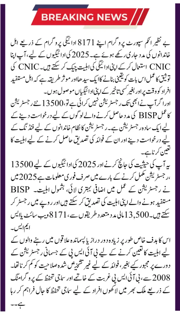 All in all, the Benazir Income Support Programme continues to make an impact through the 8171 payment programme. Eligible families can check their payment of Rs 13,500 for 2025 through SMS, the BISP web portal, or at the BISP office. For families that are not in the BISP programme yet, you can register and apply directly at your BISP Tehsil Office.