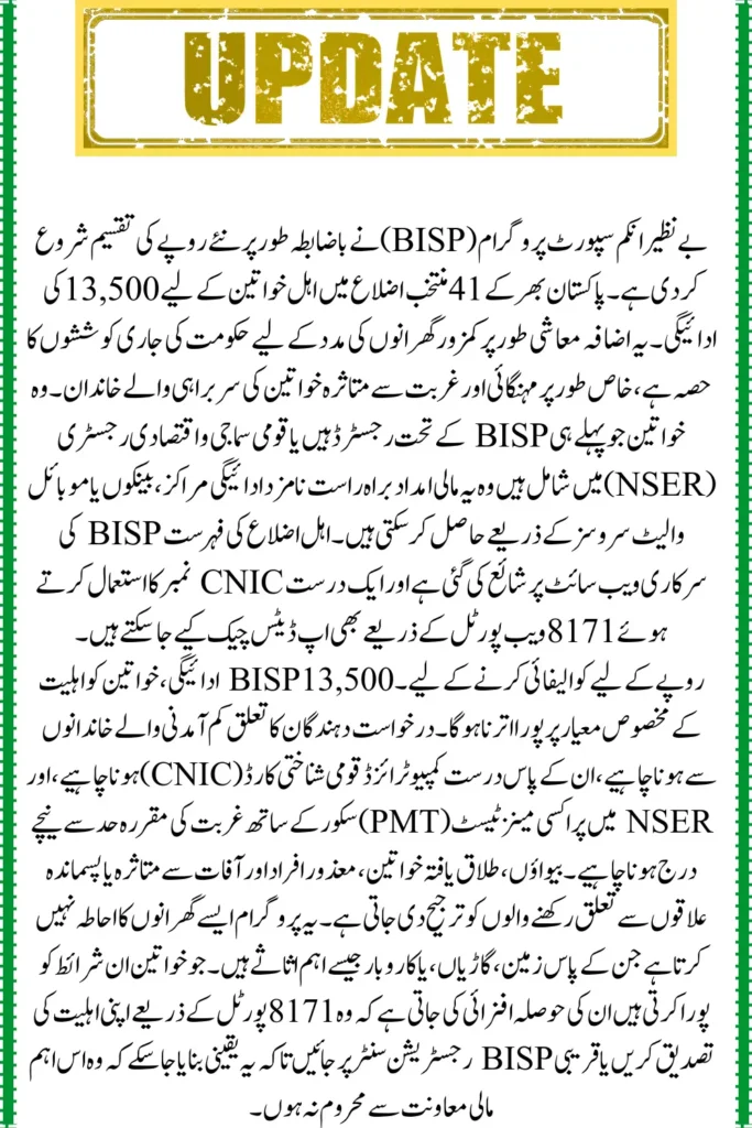 The Benazir Income Support Program’s installment of Rs. 13,500 marks another important step in supporting vulnerable women across 41 districts. By introducing secure campsite-based payments and strict verification processes, the government ensures that aid reaches those who need it most with transparency and efficiency. BISP encourages beneficiaries to check their eligibility through official channels and carry the necessary documents to ensure smooth payment collection. With robust fraud protection measures and accessible helpline services, BISP continues to strengthen its commitment to empowering women and alleviating poverty throughout Pakistan.