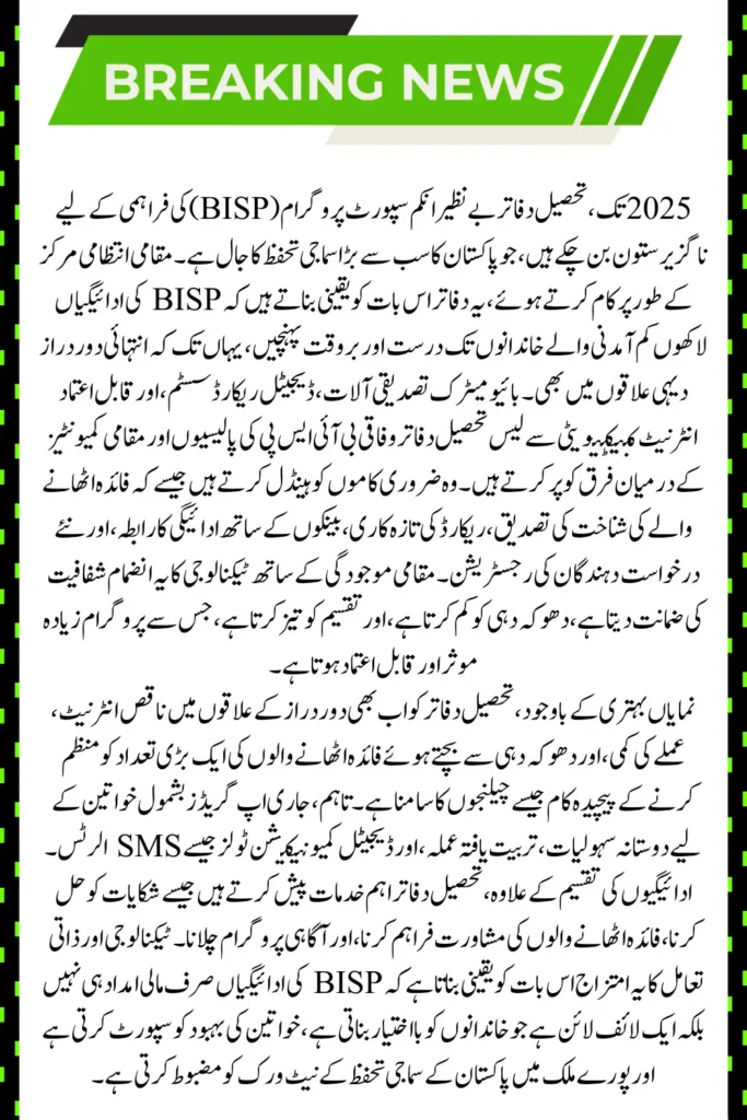 In 2025, Tehsil offices are playing a key role in facilitating BISP payments, ensuring timely and secure disbursement to beneficiaries nationwide. This local-level support helps streamline the process and provides easier access to financial assistance for families.
