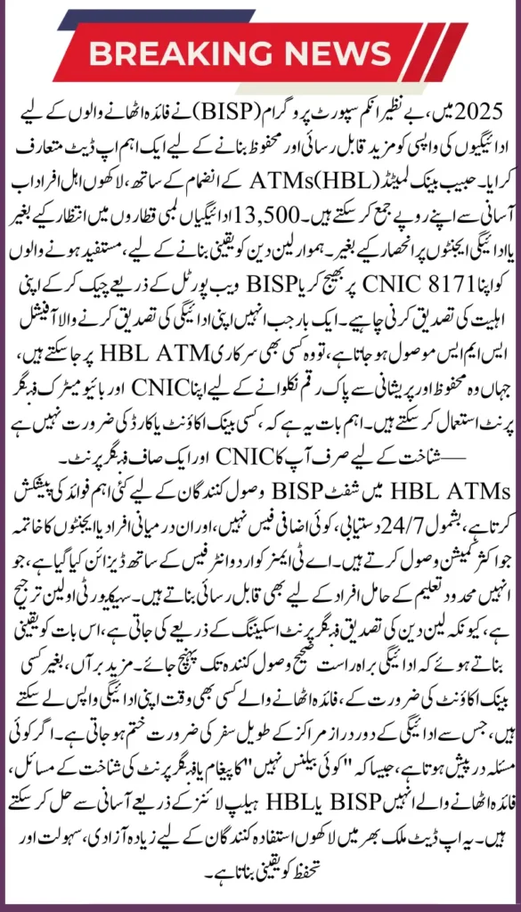 BISP has introduced a new update that allows beneficiaries to withdraw their payments directly from HBL ATMs with greater ease. The improved system reduces long queues at campsites and offers faster, more secure access to Benazir Kafalat funds.