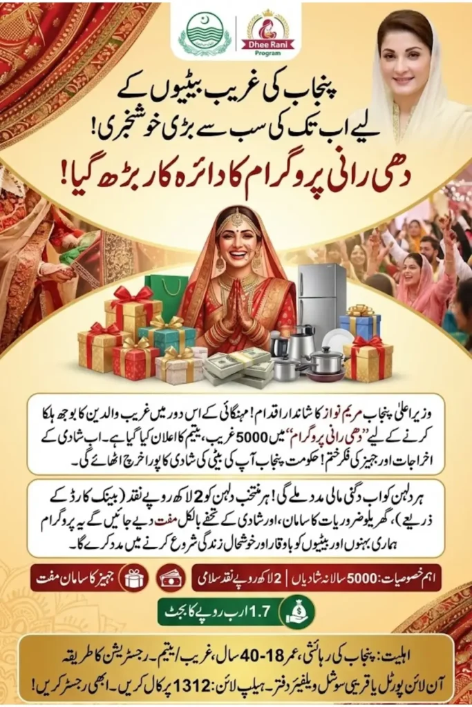 The Dhee Rani Program is a major social welfare initiative launched by the Punjab Government under the leadership of Chief Minister Maryam Nawaz. The program aims to support underprivileged families who struggle to meet marriage expenses due to inflation and financial hardship. By organizing collective marriages and offering financial assistance, the government promotes dignity, equality, and social stability.
