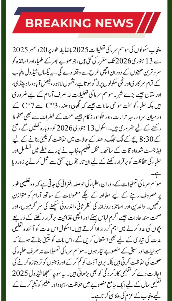 The Punjab Education Department has confirmed that all public and private schools across the province will observe winter vacations starting December 20, 2025, until January 13, 2026.