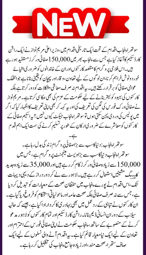 Punjab, the heart of Pakistan, has taken a major step forward in improving the lives of its sanitation workers. Under the leadership of Chief Minister Maryam Nawaz, a new Ration Card Scheme has been launched for 150,000 sanitation workers as part of the Suthra Punjab initiative. This move not only recognizes their hard work but also provides much-needed support to those who keep our streets, towns, and villages clean.