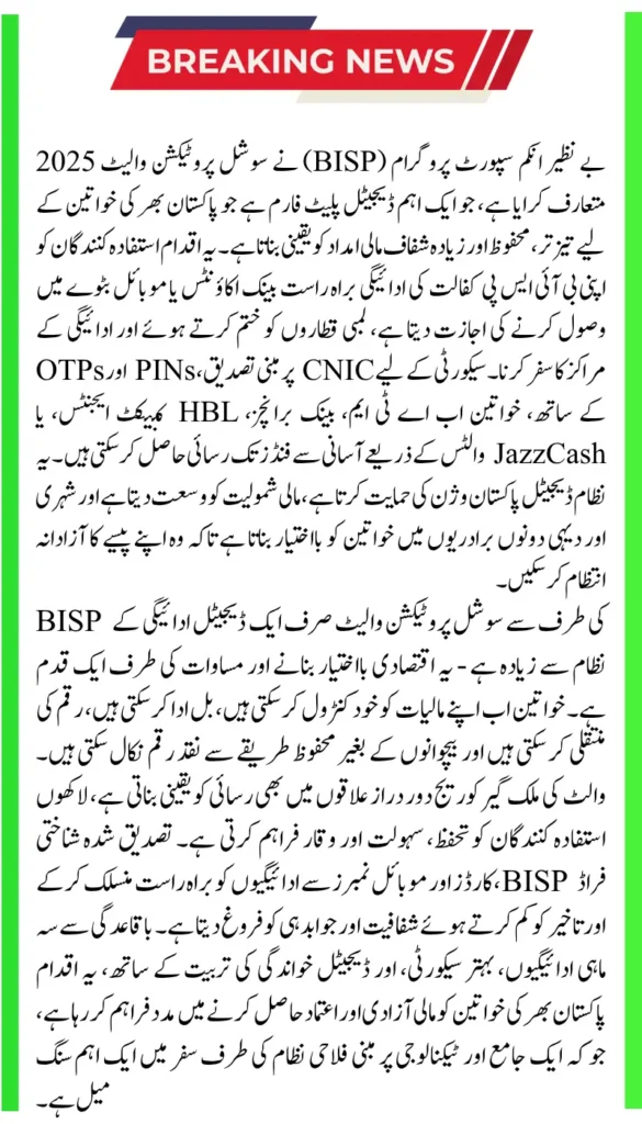 The Social Protection Wallet by BISP 2025 is a revolutionary step in women empowerment and financial inclusion. By providing secure, fast, and transparent access to funds, it eliminates the challenges of traditional payment methods while promoting digital literacy and independence for women across Pakistan.