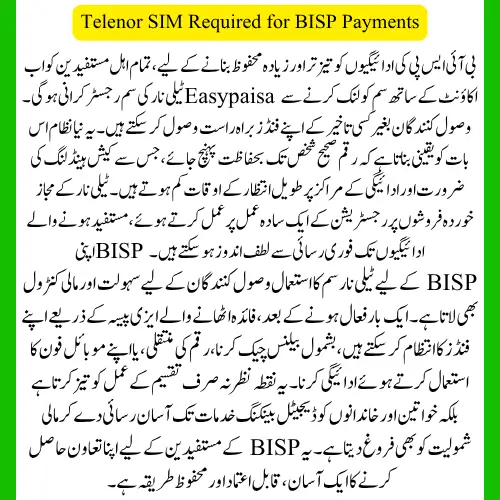 Using a Telenor SIM ensures that BISP payments are sent directly to beneficiaries without delays. By linking the SIM to an Easypaisa account, recipients can safely receive funds without the need for cash collection.